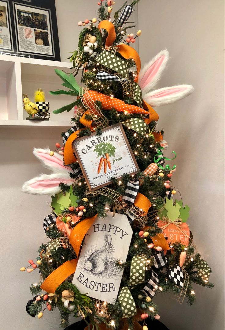 Christmas tree decorated for Easter with faux flowers, lots of Easter eggs, Easter bunnies, rabbits, jelly beans, carrots, and ribbon!